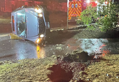 The car was reportedly speeding, drove off the road, struck a utility pole guide wire, went across a lawn and rolled onto its side landing in a driveway.