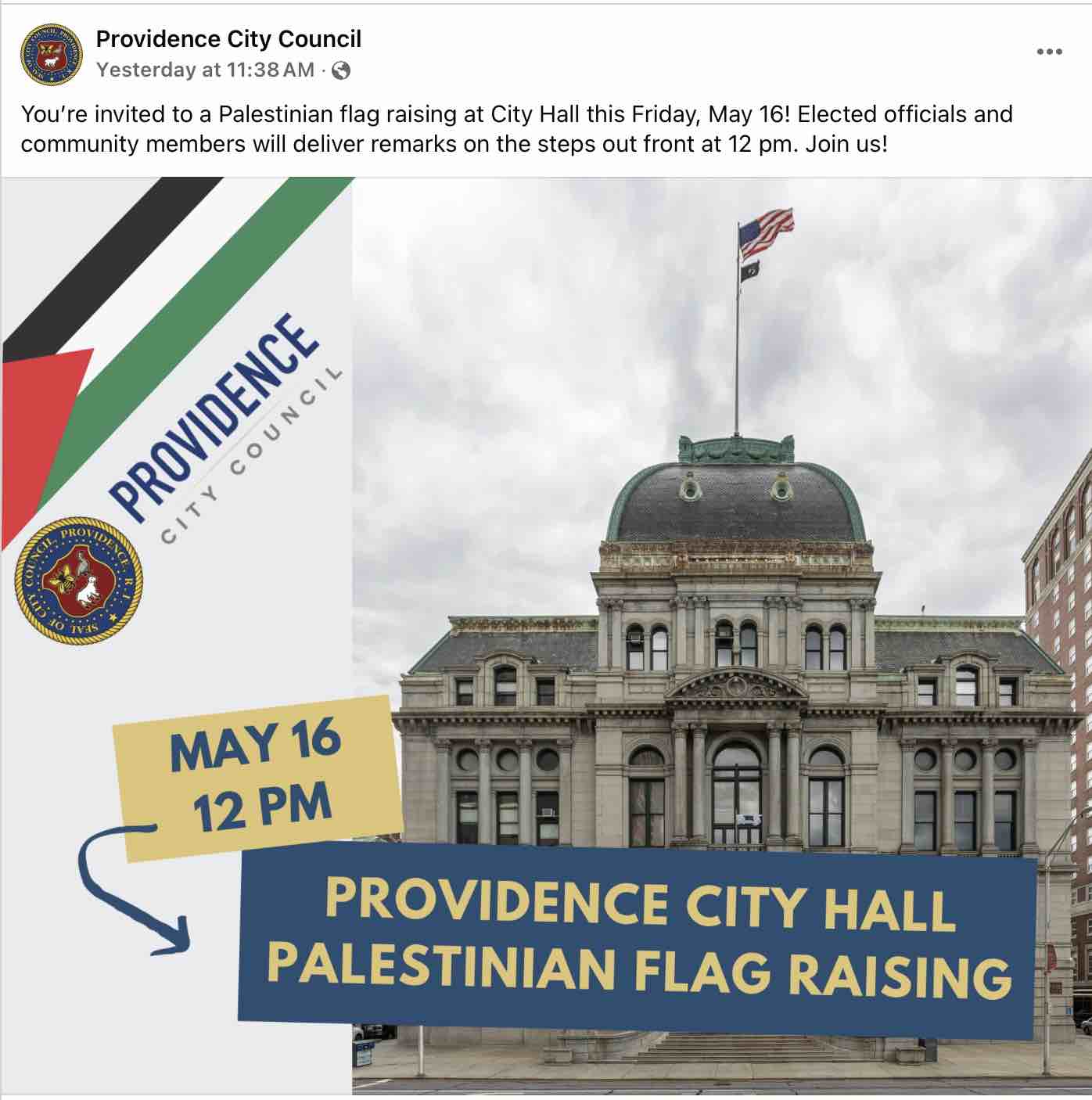 “In Providence, the executive branch and City Council are two separate branches of government,” stated Josh Estrella, a spokesman for Providence Mayor Brett Smiley.” The Providence City Council, not Mayor Smiley’s office, will be raising the Palestinian flag on Friday.”