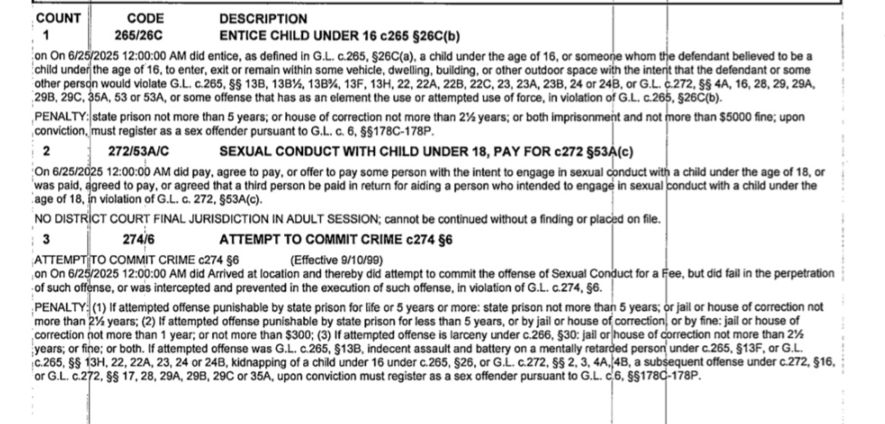 On 6/25/2025 12:00:00 AM did arrive at location and thereby did attempt to commit the offense of Sexual Conduct for a Fee, but did fail in the perpetration of such offense, or was intercepted and prevented in the execution of such offense, in violation of G.L. c.274, §6.