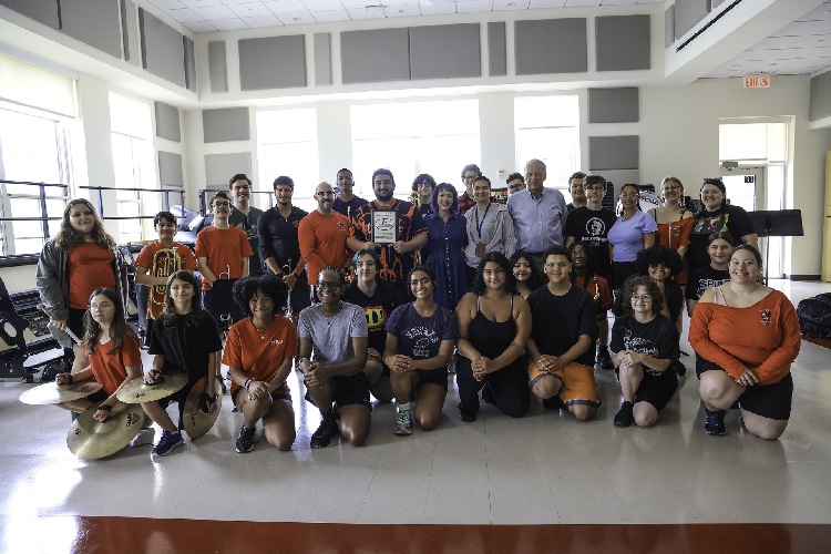Ernie Boch Jr. and The Music Drives Us Foundation and partner Falcetti Music School came through and presented Band Director Julia Klingner, Assistant Band Director Ryan Lewis, Percussion Instructor Pedro Silva, and the B.M.C. Durfee Marching Band a Vibraphone with field frame, xylophone with field frame, a full set of crotales and a bunch of mallets.