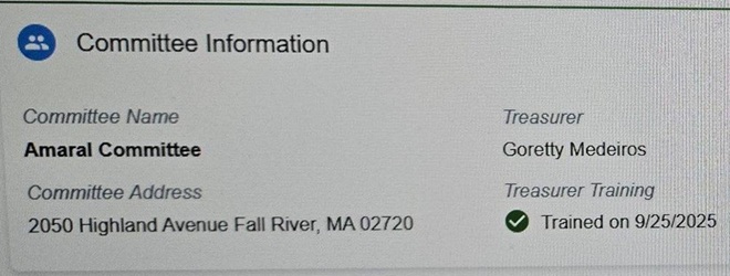 “As the current “Certified Treasurer” for the committee to elect Gabriel “Boomer” Amaral for Mayor of Fall River, I have to set the record straight and call out the false statements that were made by the current Mayor Paul Coogan, about Boomer’s filing with the OCPF from Tuesday’s debate. I’m a business owner in the city of Fall River and refuse to have my name tarnished by lies. You can find all this information on www.ocpf.us and see that this account has been in good standing for 2025 and any issues Boomer had with his previous Treasurer was all resolved.