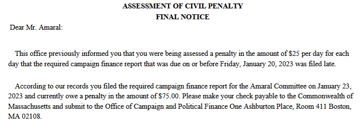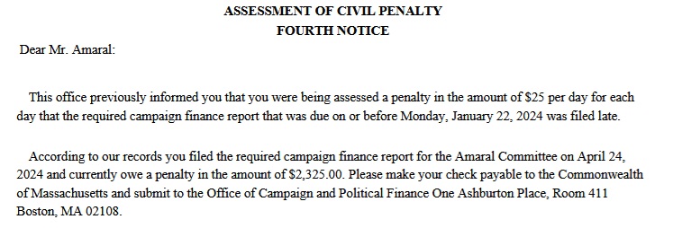 Fall River Reporter looked at Amaral’s OCPF which does not appear to show any violations in 2025.