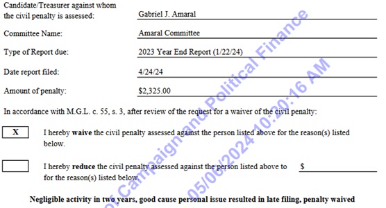 In 2024, Amaral was initially penalized $2,325 for filing late ($25 per day) after multiple warnings, however, the fine was later waived after Amaral filed a waiver due to “negligible activity in two years, good cause personal issue resulted in late filing.”