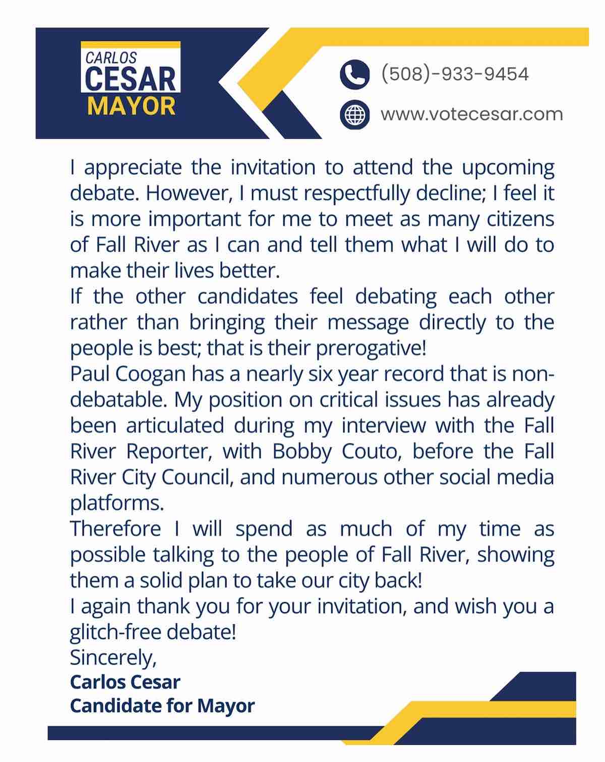 On Tuesday, Cesar sent an email to the Fall River Reporter, the host of the Sept. 4 debate, that while he appreciated the invitation, “I must respectfully decline. I feel it is more important for me to meet as many citizens of Fall River as I can and tell them what I will do to make things better.”