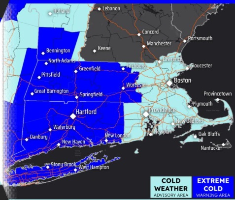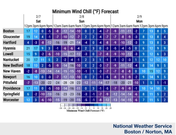 An Extreme Cold Warning and Cold Weather Advisory has also been issued for Saturday night’s dangerous wind chills. For the interior, wind chills down to 30 below are possible. For eastern MA and RI, wind chills down to -20F are possible. Limit outdoor exposure in these conditions.