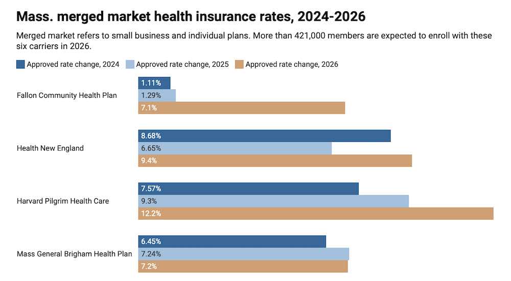 The Division of Insurance approved 2026 rates for six insurers in the merged market, which provides a subset of Bay Staters with health insurance through individual and small business plans. Costs will rise for customers on all six of those carriers, albeit with less growth than the companies originally proposed, following negotiations with state regulators and scrutiny from figures including Gov. Maura Healey.