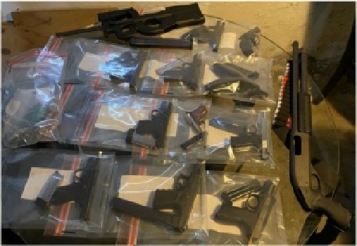 A search of Lenardis’ residence in Saugus on Oct. 25, 2022 resulted in the seizure of an industrial pill press; 14 firearms including a Glock outfitted to operate as a machinegun; at least 1.85 kilograms of pills; powder containing methamphetamine; at least 87.6 grams of pills and powder containing fentanyl and “M30” stamps commonly used to manufacture counterfeit pills.