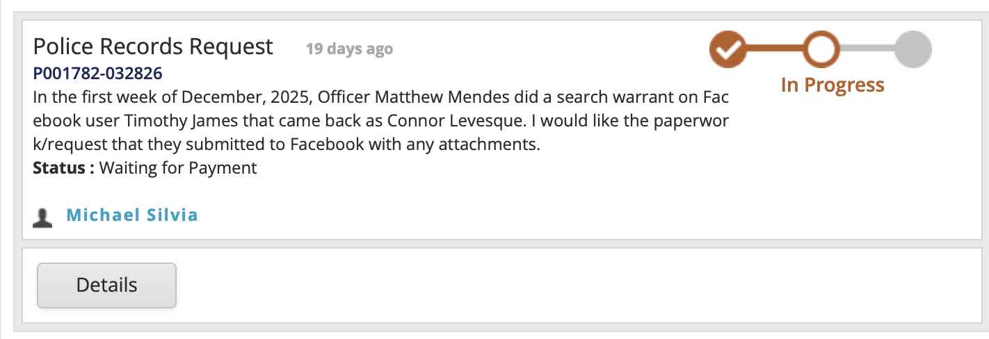 Last month, I published an article detailing how the FRPD used the criminal justice system to obtain a search warrant under questionable pretenses to uncover the identity behind a fake Facebook profile, which posted critical comments about FRPD personnel—including Detective Christopher Teves (son of Chief Kelly Furtado)—between November 17 and December 3, 2025. The FRPD received information from Facebook in less than 24 hours. I’ve been told there is a way to speed up the process if you alert Facebook that the there is danger for a police officer or the public. I wanted to know exactly what they told Facebook to get a response so quickly because the social media posts where not threatening in anyway.