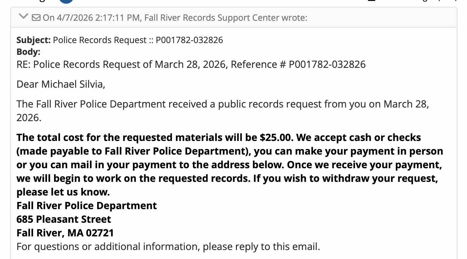 The Fall River Police Department (FRPD) continues to delay our public records requests – this time delaying access to a critical record related to their questionable search warrant that Mayor Coogan has been blocking the city council from investigating.