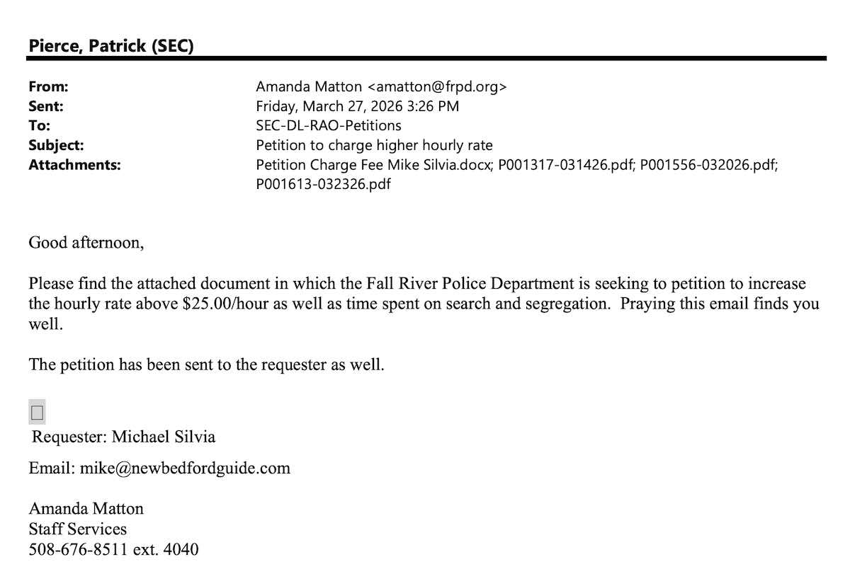 The Fall River Police Department (FRPD) asked the Secretary of State’s Public Records Division for permission to charge Fall River Reporter nearly twice the $25 an hour rate for public information requests, but was quickly denied by the Supervisor of Records. This is the first time Fall River Reporter has ever been asked to pay for a public records and comes shortly after we published From “One of the Best” to Targeted: How Fall River Police Department Weaponized a Warrant Against Ex-FRPD Officer.