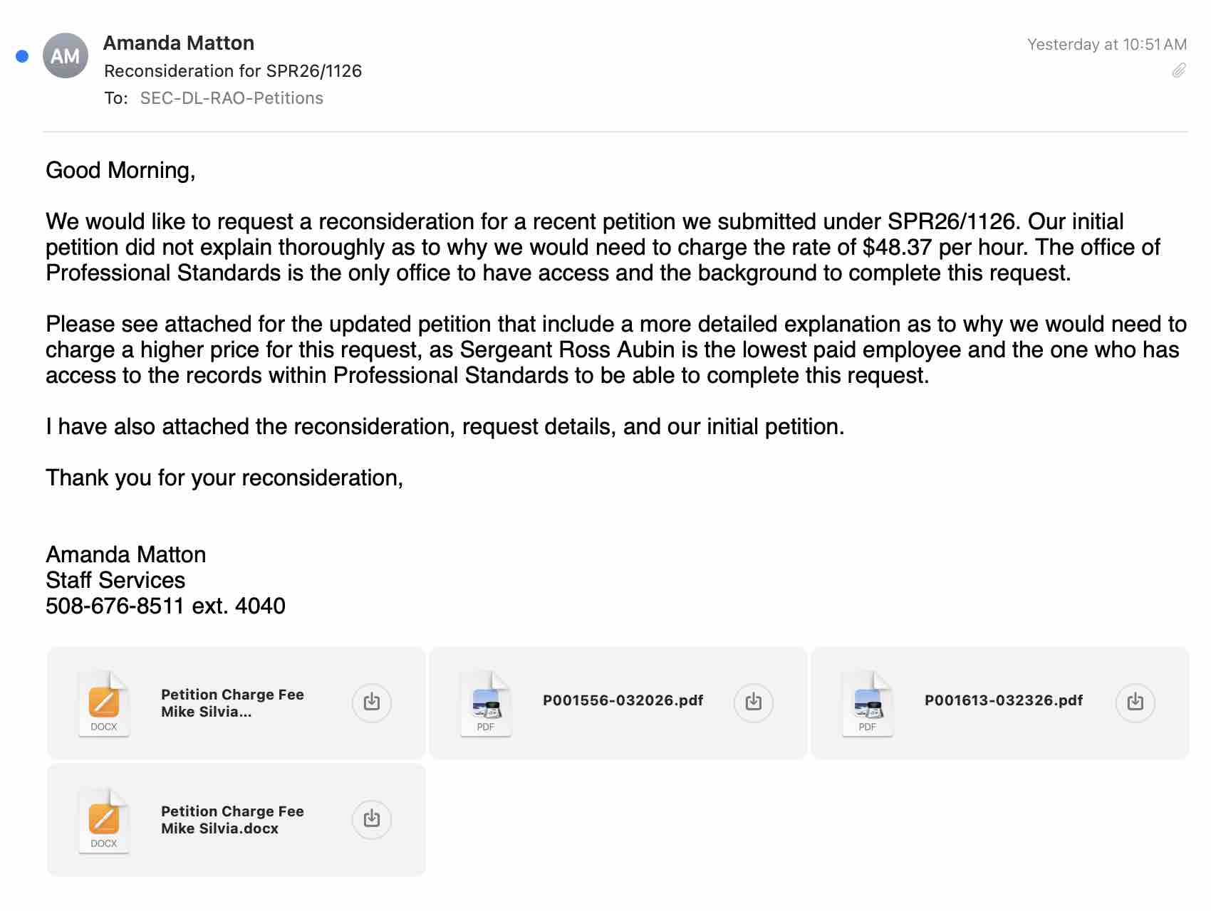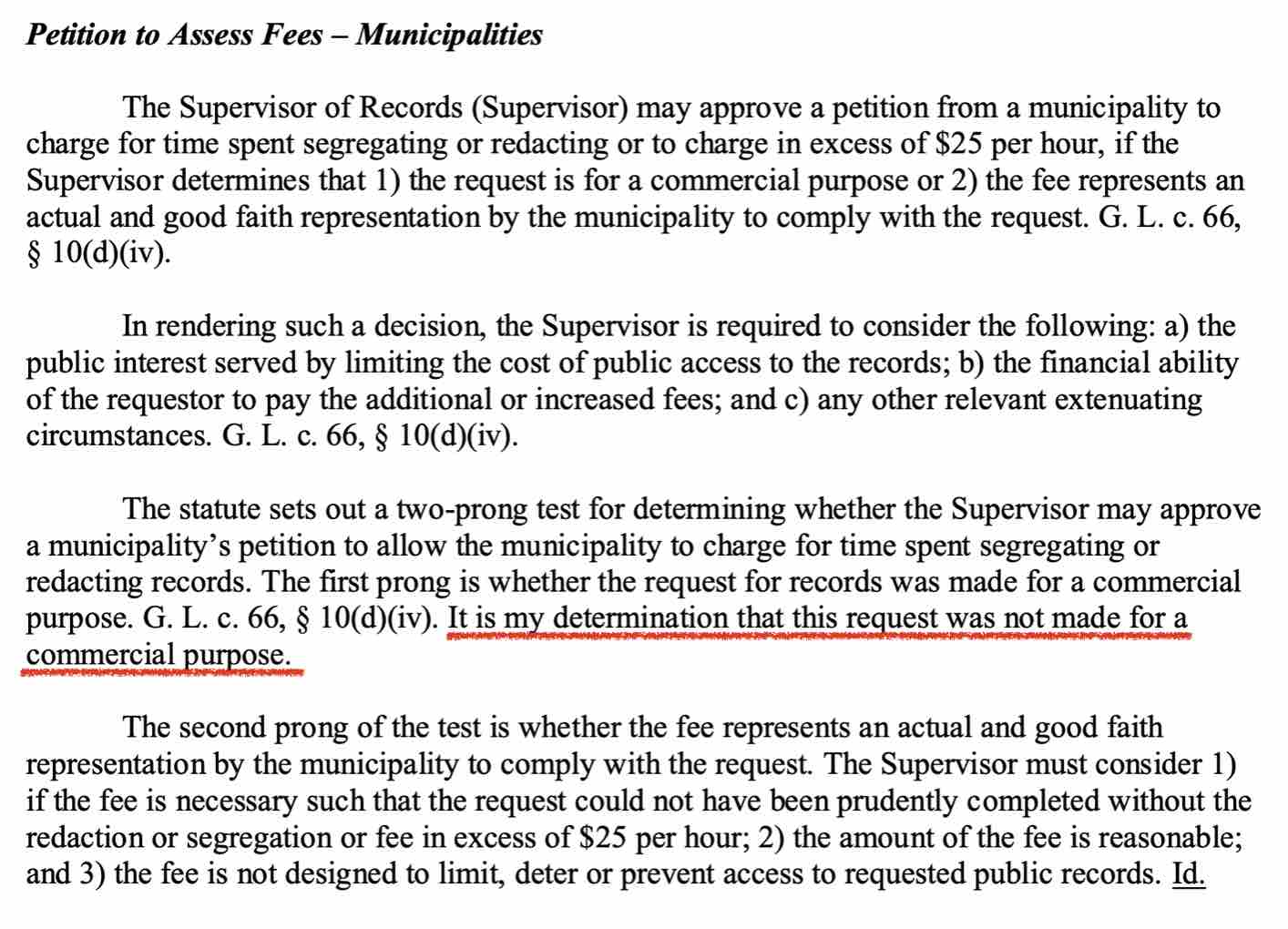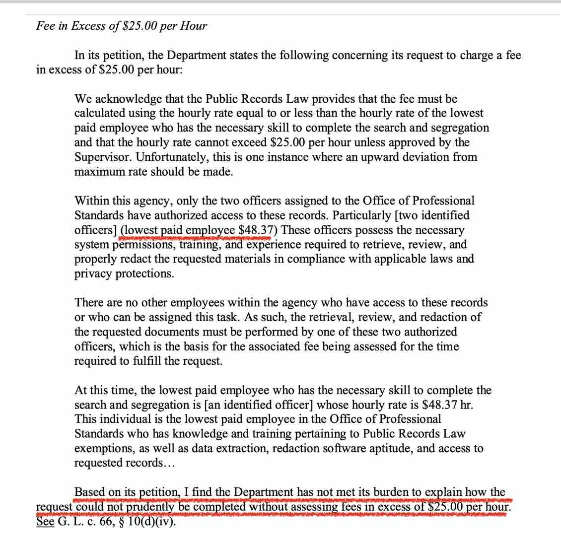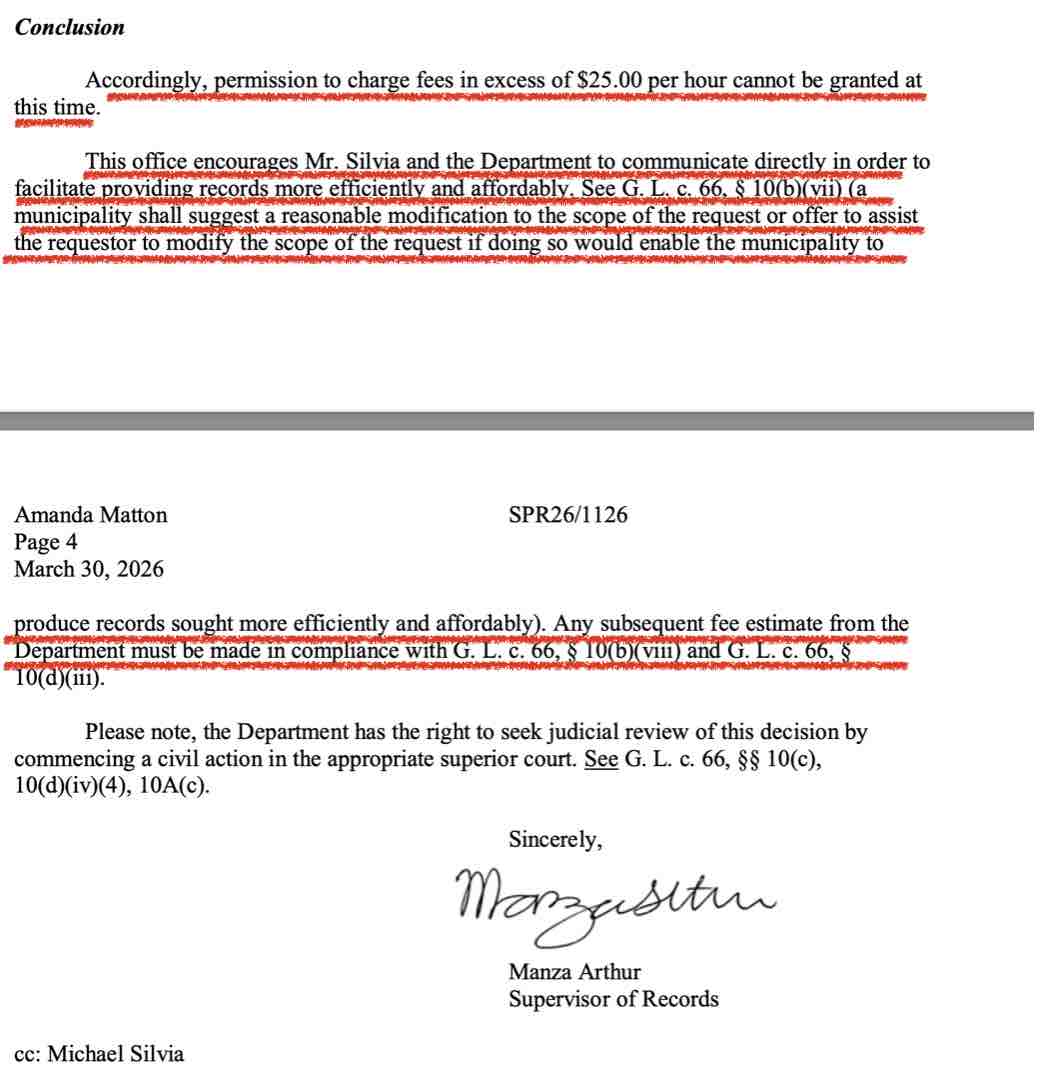 In response the following Monday, the Public Records Division denied the FRPD’s request to bill Fall River Reporter more than the $25 an hour rate. (Of note, state law provides that the first two hours of public record requests are at no charge).