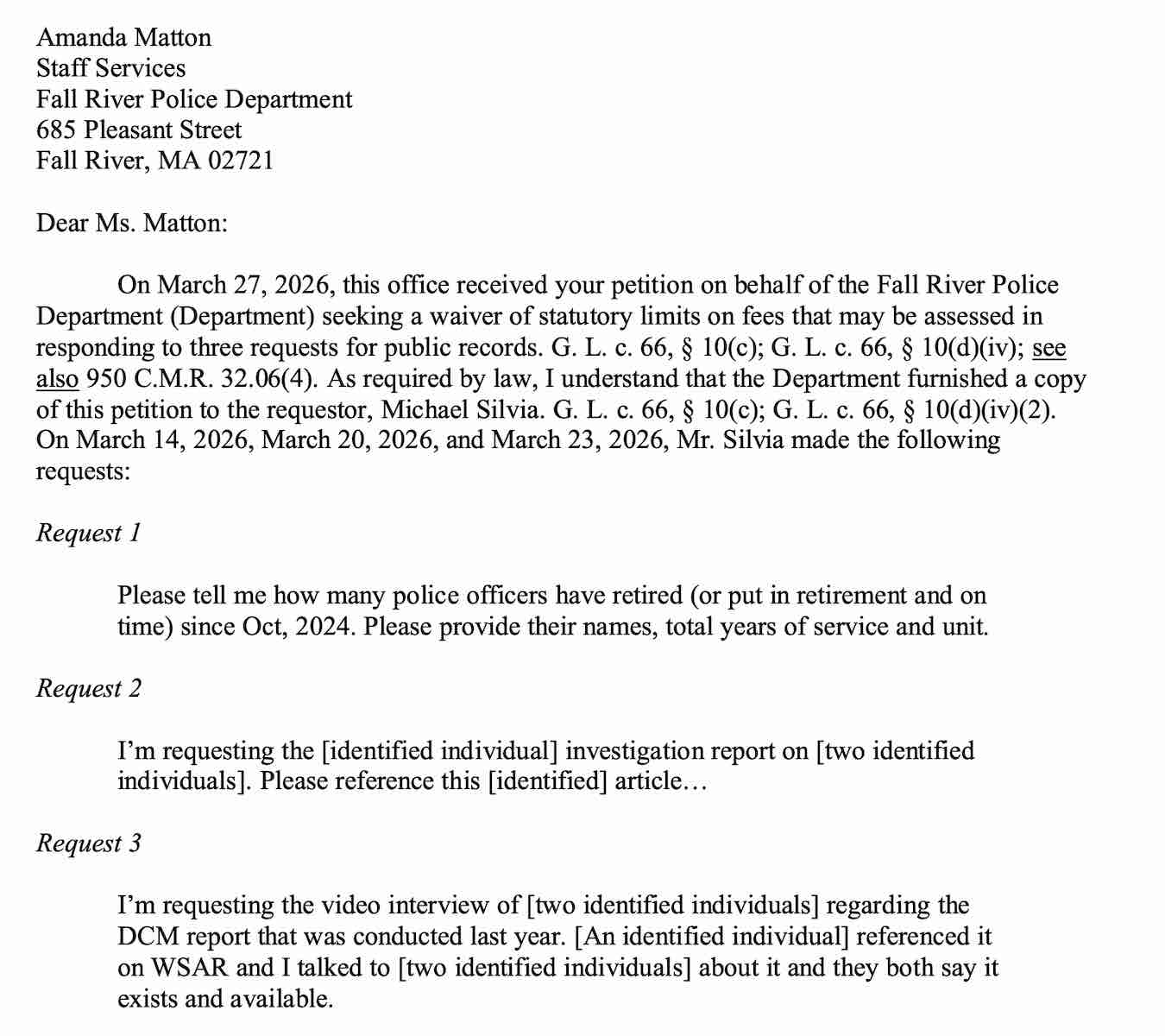It is my belief that the City of Fall River, and now the FRPD, are not very transparent and force people to jump through hurdles to get access to public documents. Mayor Coogan used the courts to block the John Perry report, forcing The Herald News to spend over $100,000 over 18-months to get a judge to force the release. The City of Fall River had to pay The Herald News much of the money back in a settlement. This also aligns with Massachusetts winning the Society of Professional Journalists’ 2026 Black Hole Award due to the state “demonstrating a troubling lack of transparency and disregard for the public’s right to know.”