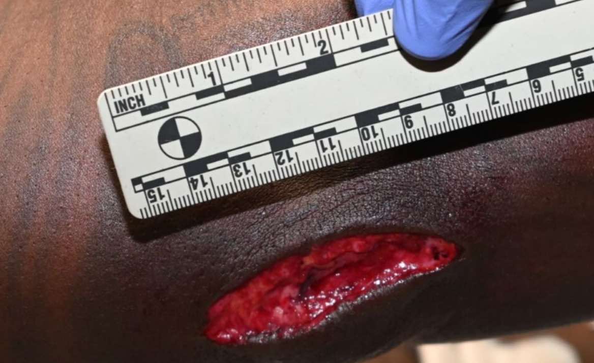 During the physical struggle, the suspect produced a firearm. While on the ground the suspect began firing at police, striking one officer in the elbow and a second officer in the abdomen striking his bullet resistant vest.