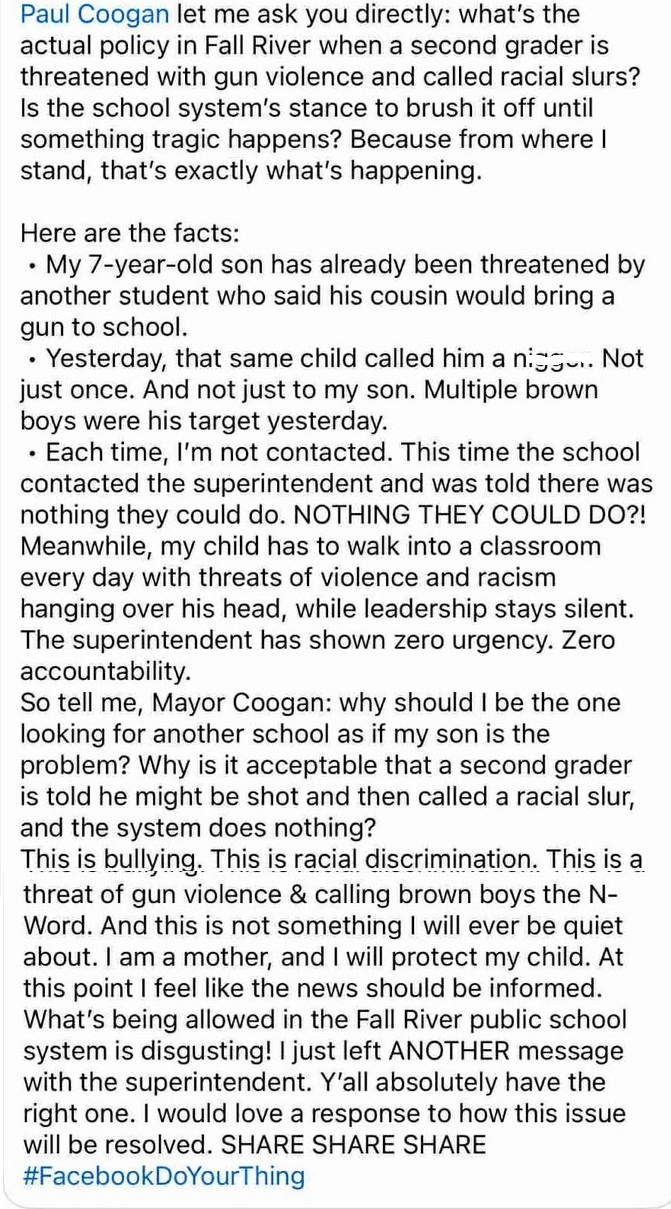 A mother who stated that her son attends a Fall River public school posted the following on Tuesday.