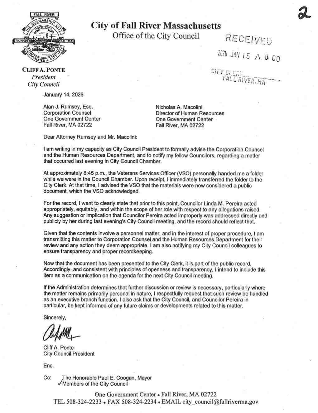First, is the letter City Council President Cliff Ponte sent to City of Fall River’s Corporation Counsel Alan Rumsey and Director of Human Resources Nicholas Macolini detailing how Talos Farris handed him a folder containing the results of the investigation. This happened after councilor Pereira revealed that the investigation cleared her of any wrongdoing.