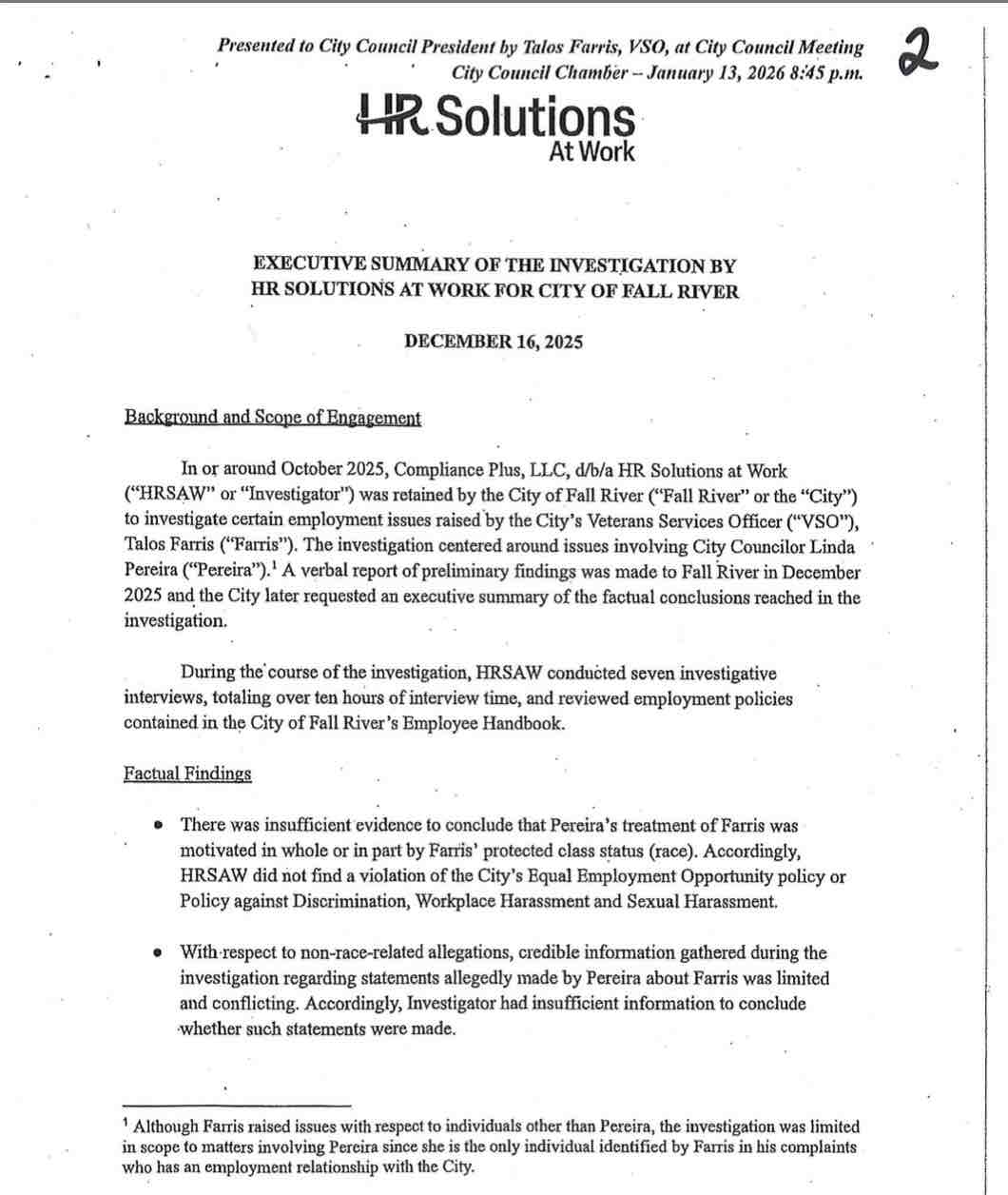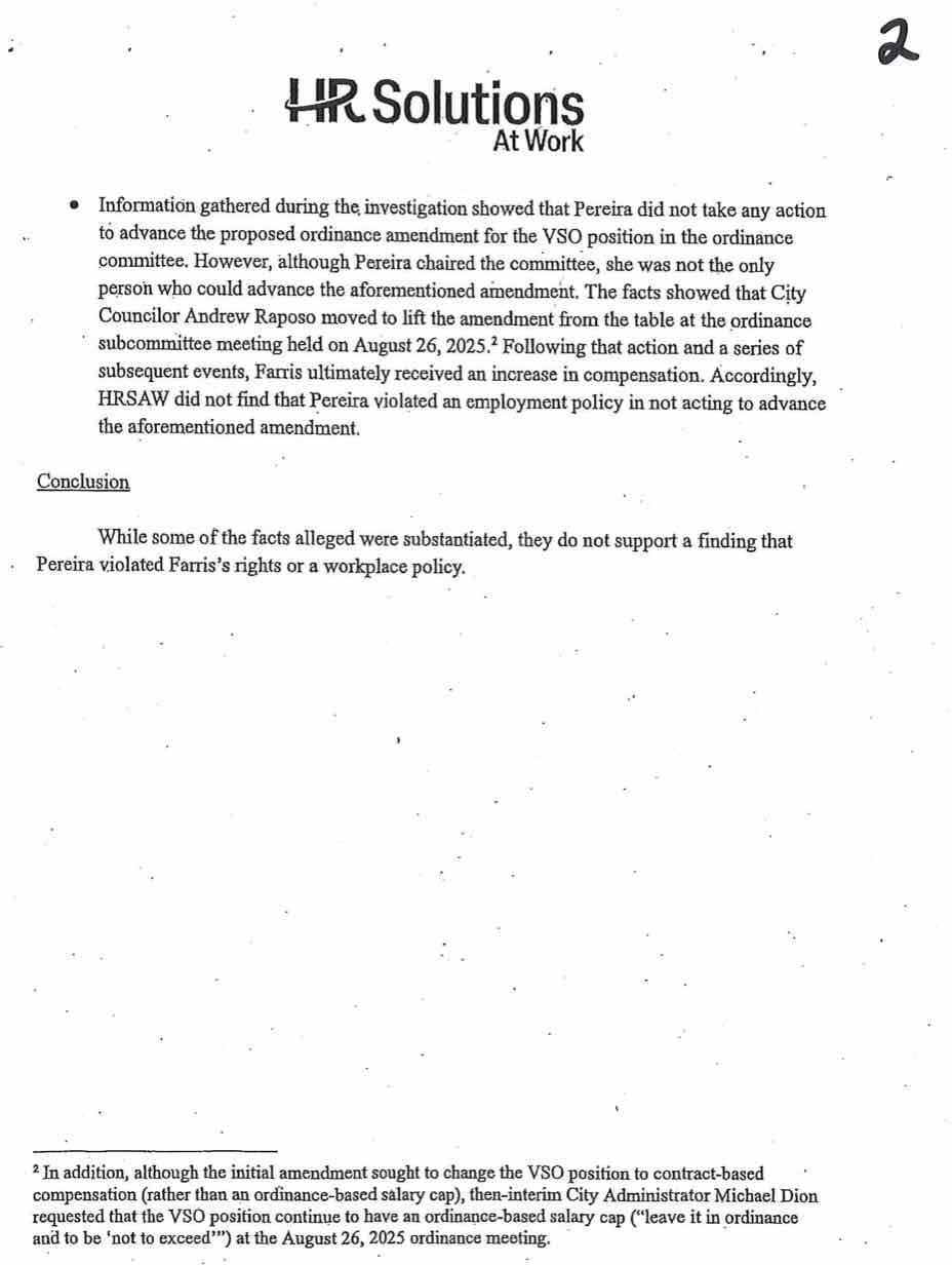 Fall River Reporter has obtained the results of the human resource investigation into Fall River City Councilor Linda Pereira – accused of political interference by Fall River Veterans Agent Talos Farris.