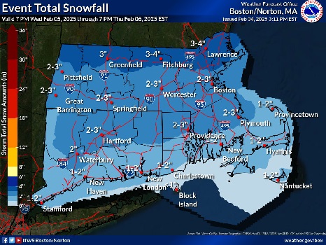 According to the National Weather Service, Massachusetts, Connecticut and Rhode Island, excluding the Cape and Islands, will be under a Winter Weather Advisory from 7:00 a.m. to 7:00 p.m. on Thursday.