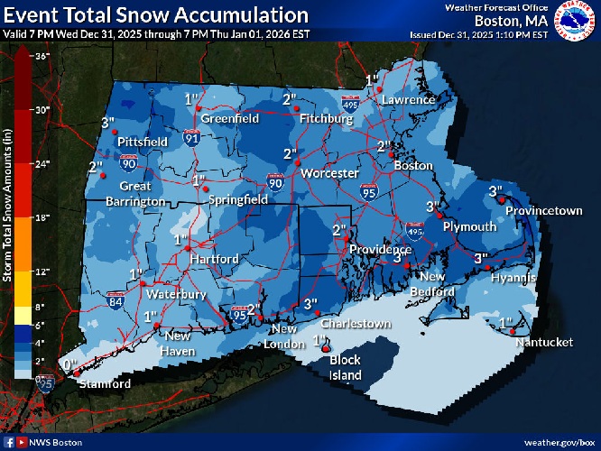 Total snow accumulations between 2 and 4 inches are expected with highest snowfall amounts for Cape Cod, the western hills of the Tolland Hills of northeast Connecticut and the western hills of Worcester County in central Massachusetts.