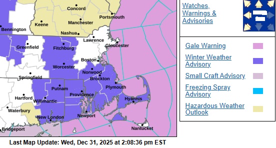 According to the National Weather Service, a Winter Weather Advisory is in effect from 7:00 p.m. today until 1:00 p.m. Thursday for portions of northern Connecticut, central, eastern,